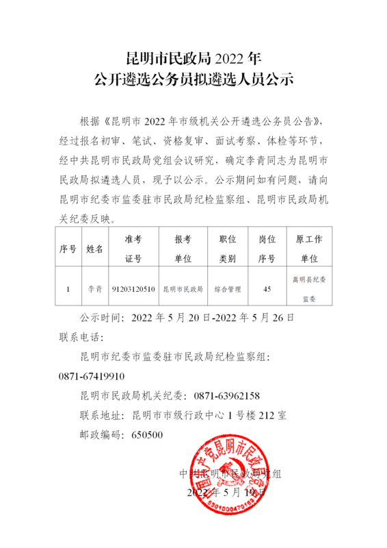 昆明市民政局2022年公開遴選公務(wù)員擬遴選人員公示