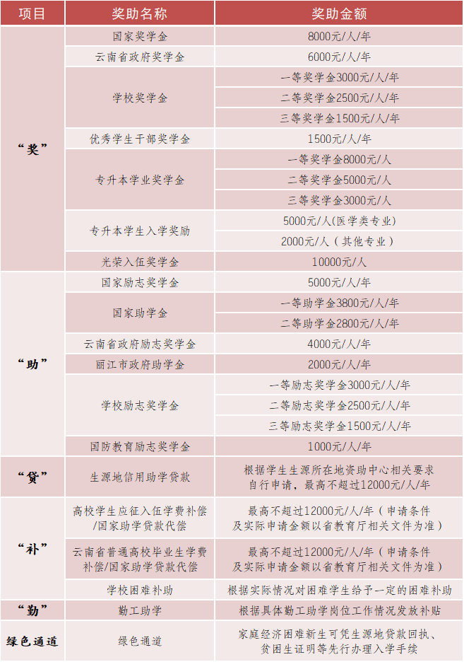 麗江文化旅游學(xué)院(原云南大學(xué)旅游文化學(xué)院)自2020年起,單獨(dú)設(shè)立專升本學(xué)生專項(xiàng)資助獎(jiǎng)勵(lì)體系,對(duì)學(xué)業(yè)優(yōu)秀的學(xué)生和貧困學(xué)生進(jìn)行獎(jiǎng)勵(lì)和資助。