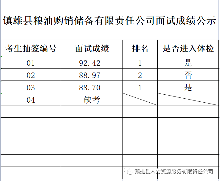 鎮(zhèn)雄縣糧油購銷儲備有限責(zé)任公司面試成績公示 鎮(zhèn)雄縣糧油購銷儲備有限責(zé)任公司公開招聘合同制工作人員于2022年5月27日進(jìn)行面試,現(xiàn)將面試情況公示如下: