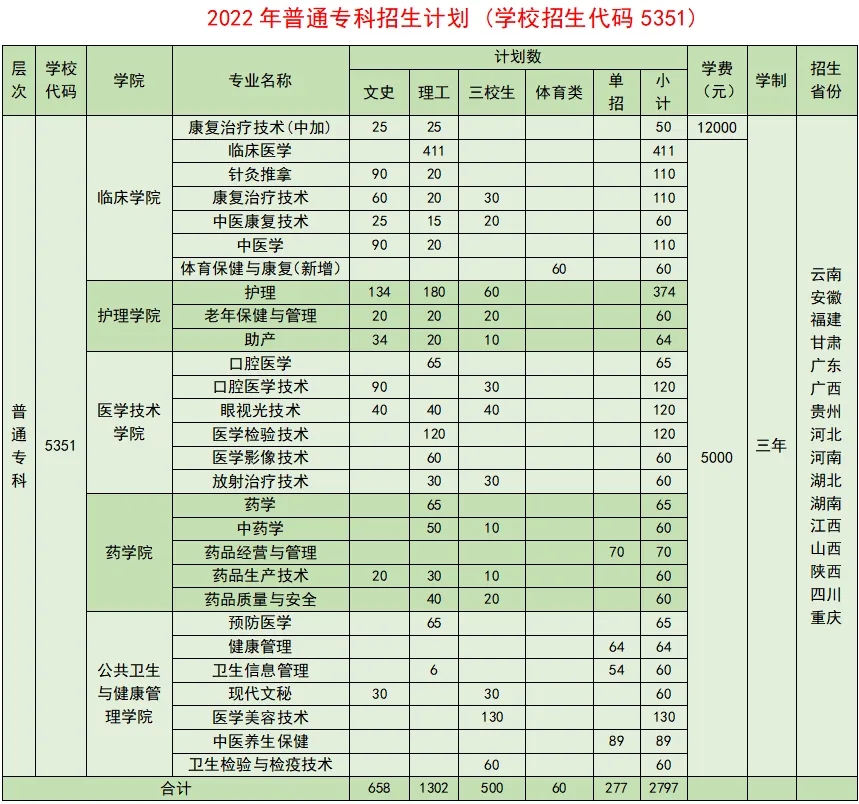 曲靖醫(yī)學(xué)高等專科學(xué)校2022年招生計(jì)劃