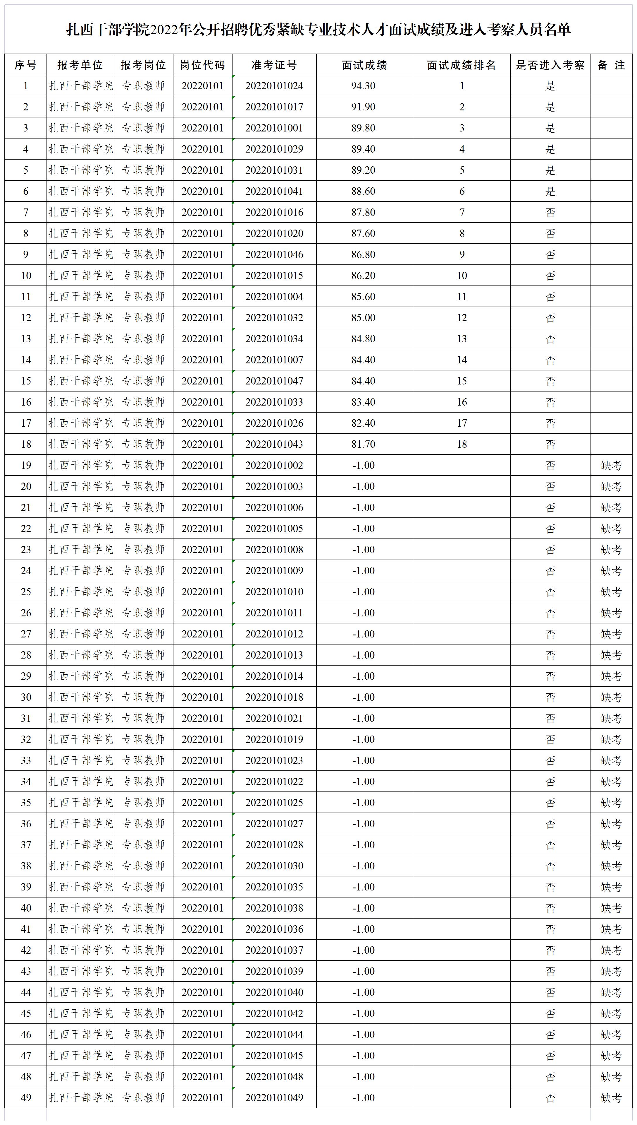 扎西干部學(xué)院2022年公開招聘優(yōu)秀緊缺專業(yè)技術(shù)人才面試成績及進(jìn)入考察人員公示