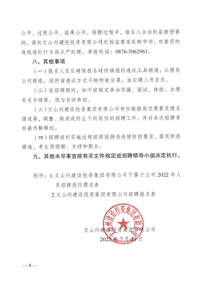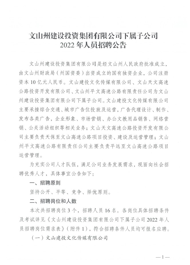 文山州建設(shè)投資集團(tuán)有限公司下屬子公司2022年人員招聘公告