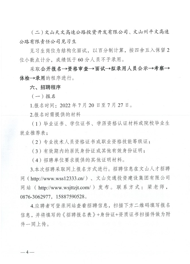 | 2 | 文山天文高速公路投資開發(fā)有限公司 | 見習(xí)生 | 3 | 全日制大學(xué)專科及以上 | 不限 | 1.在值班站長的領(lǐng)導(dǎo)下負(fù)責(zé)當(dāng)班期間收費(fèi)工作; 2.嚴(yán)格執(zhí)行自動(dòng)化收費(fèi)操作流程和收費(fèi)標(biāo)準(zhǔn),負(fù)責(zé)按時(shí)足額上繳通行費(fèi)收入; 3.正確處理收費(fèi)工作中出現(xiàn)的緊急事件,遇重大問題和突發(fā)情況要及時(shí)請(qǐng)示匯報(bào); 4.發(fā)放、回收通行卡,認(rèn)真核對(duì)車輛信息,發(fā)現(xiàn)違章、逃費(fèi)和有肇事痕跡的車輛,要及時(shí)滯留和報(bào)告。 | 1.年齡18-30周歲(含30周歲); 2.畢業(yè)2年內(nèi)或仍在就業(yè)期的往屆畢業(yè)生; 3.身高:男性165CM及以上,女性155CM及以上; 4.五官端正,視力良好,有一定語言表達(dá)能力; 5.身體健康,無紋身無傳染病史無犯罪記錄; 6.具有良好的道德品質(zhì)和敬業(yè)精神,責(zé)任心強(qiáng),團(tuán)結(jié)精神好,心理健康,能講普通話,具有較好的服務(wù)意識(shí)和溝通能力; 7.熟練應(yīng)用office辦公軟件 | 見習(xí)期工資2800元/月 |