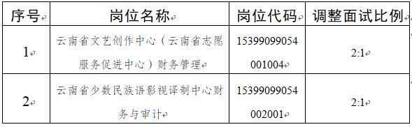 根據(jù)《云南省事業(yè)單位公開招聘工作人員辦法》(云人社發(fā)〔2016〕182號)等有關文件規(guī)定及《云南省委宣傳部直屬事業(yè)單位2022年公開招聘工作人員公告》要求,經(jīng)報省委組織部同意,現(xiàn)將部分崗位面試比例調整及崗位裁減情況公告如下: