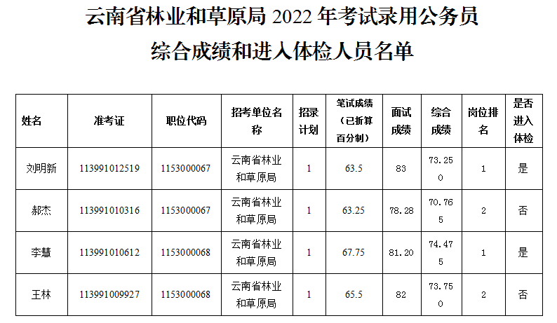 附件:云南省林業(yè)和草原局2022年度考試錄用公務員綜合成績表和進入體檢人員名單