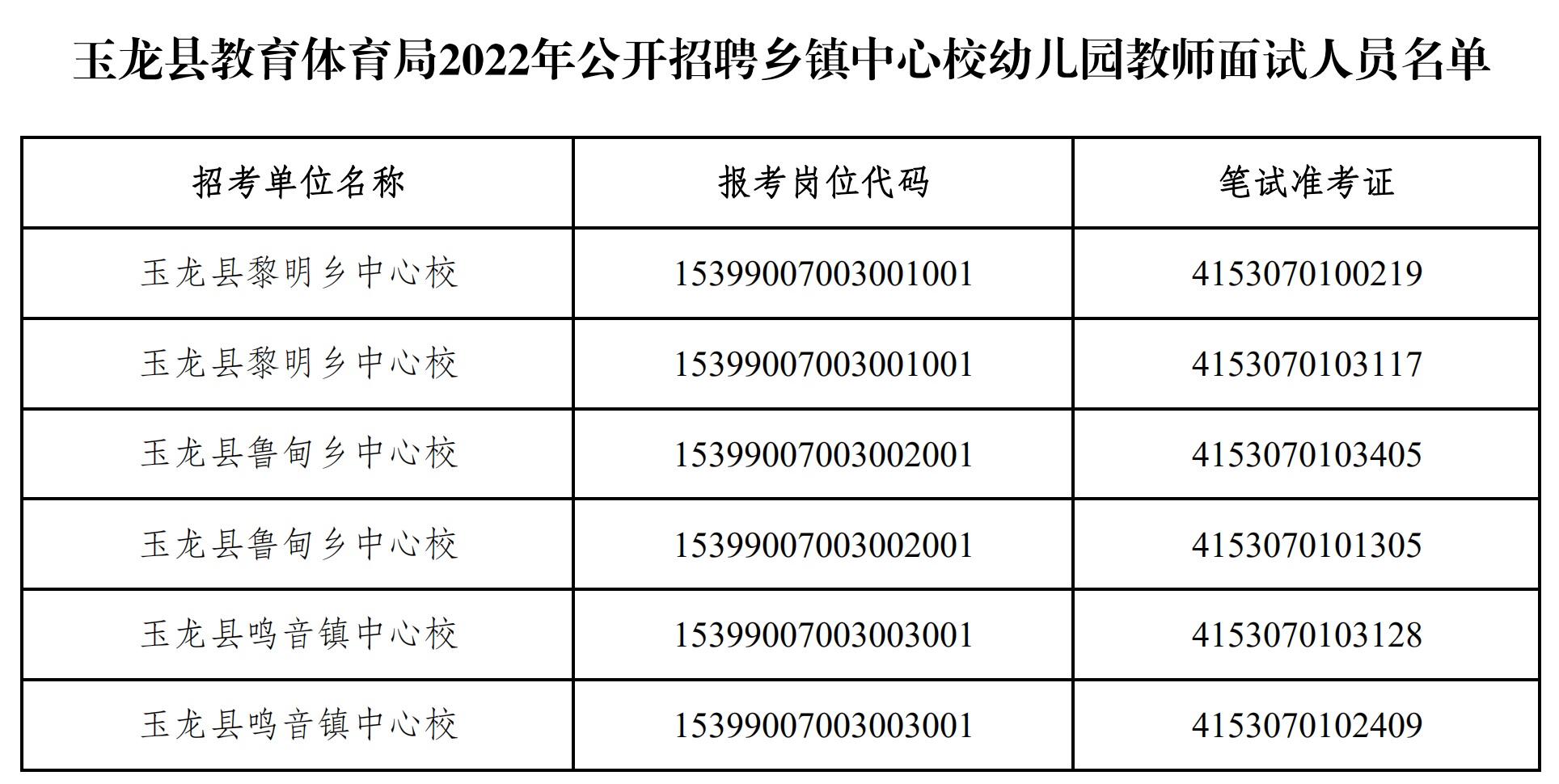 玉龍縣教育體育局2022年公開招聘鄉(xiāng)鎮(zhèn)中心校幼兒園教師面試公告