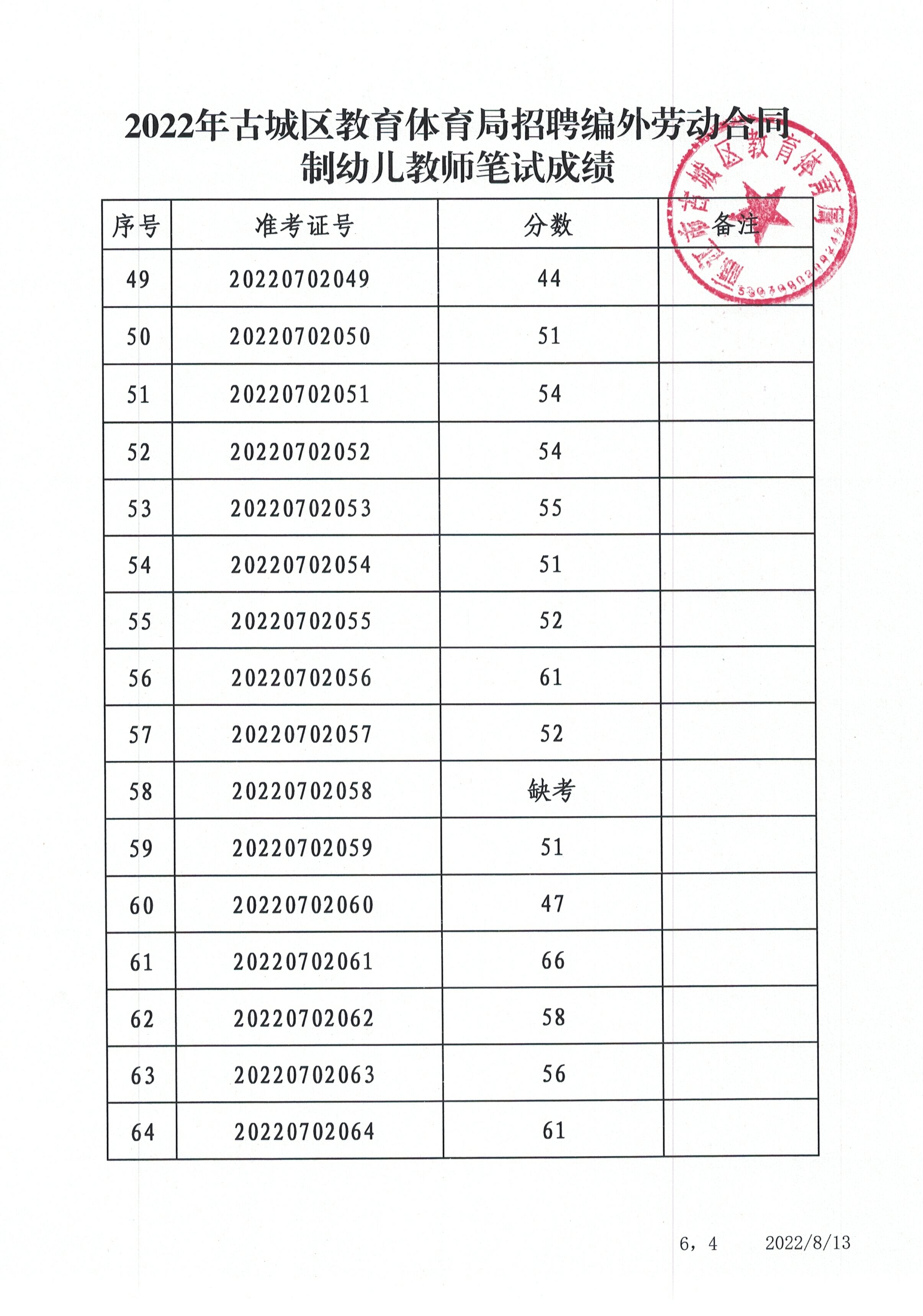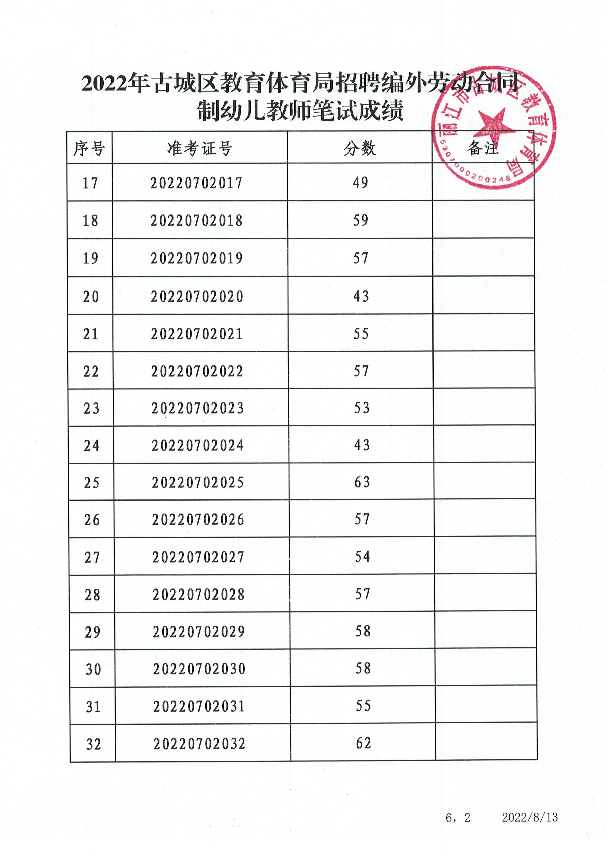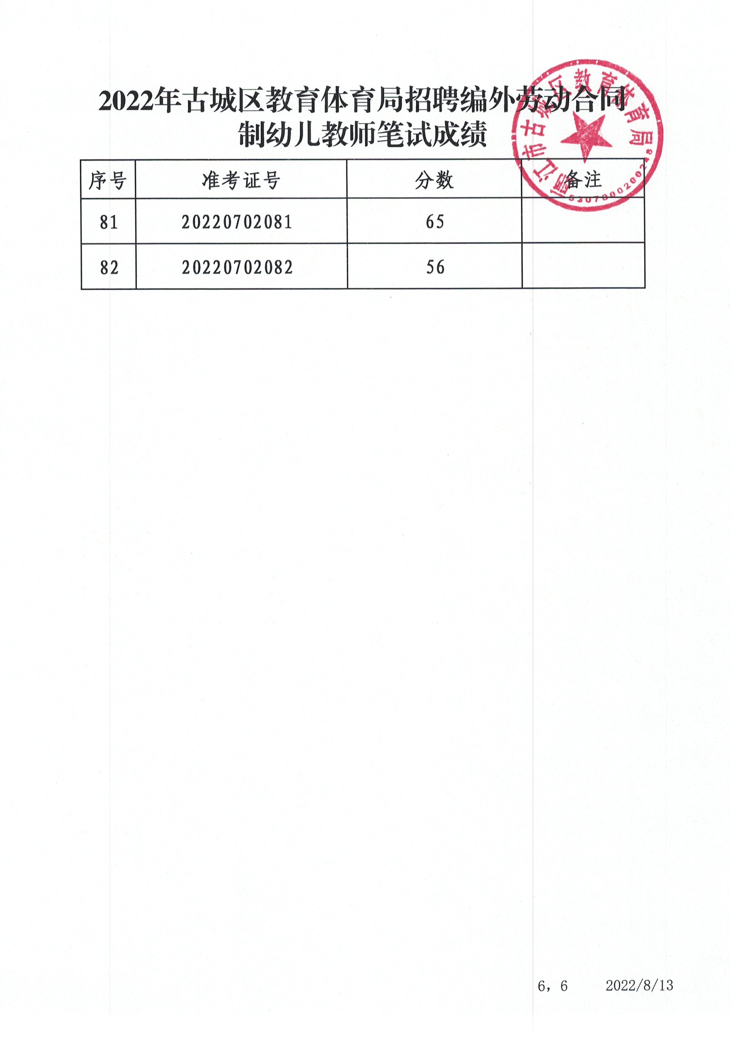 2022年古城區(qū)教育體育局招聘編外勞動合同制幼兒教師筆試成績