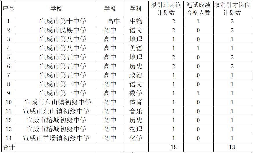 根據(jù)《中共曲靖市委曲靖市人民政府關(guān)于創(chuàng)新人才工作機(jī)制促進(jìn)經(jīng)濟(jì)社會(huì)發(fā)展的意見》(曲發(fā)〔2014〕19號(hào))、《曲靖市“珠源人才計(jì)劃”教育人才專項(xiàng)實(shí)施細(xì)則》(曲黨人才〔2021〕4號(hào))、《關(guān)于<關(guān)于擴(kuò)大“曲靖市珠源人才計(jì)劃”教育人才專項(xiàng)引進(jìn)對(duì)象范圍的請(qǐng)示>的批復(fù)》和《云南省宣威市教育體育系統(tǒng)2022年教育專項(xiàng)人才引進(jìn)公告》相關(guān)規(guī)定:“成績(jī)達(dá)到最低控制線(60分)即為筆試合格。”、“通過筆試人員按成績(jī)從高到低排序,根據(jù)引才崗位需求以不低于1:2比例進(jìn)入面試環(huán)節(jié)”。根據(jù)筆試成績(jī)情況,所有引才崗位均未達(dá)到此要求,需取消全部引進(jìn)崗位計(jì)劃,現(xiàn)公告如下: