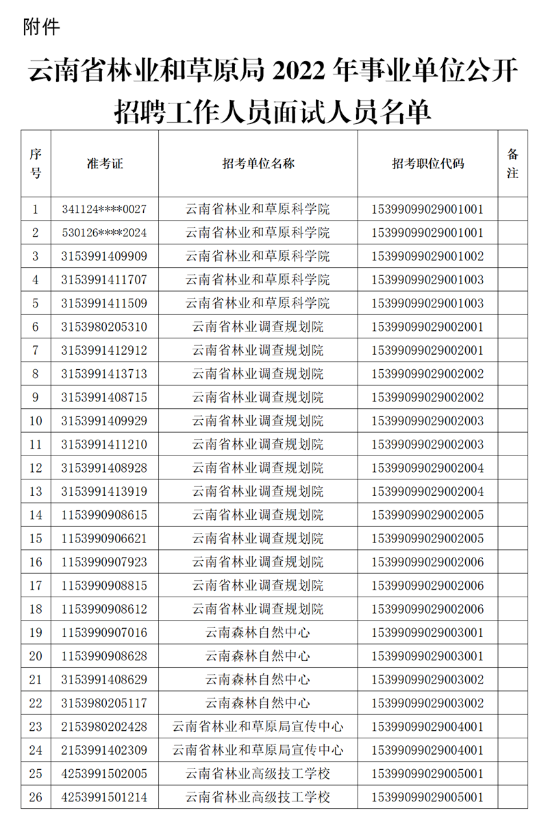 附件:云南省林業(yè)和草原局2022年事業(yè)單位公開招聘工作人員面試人員名單