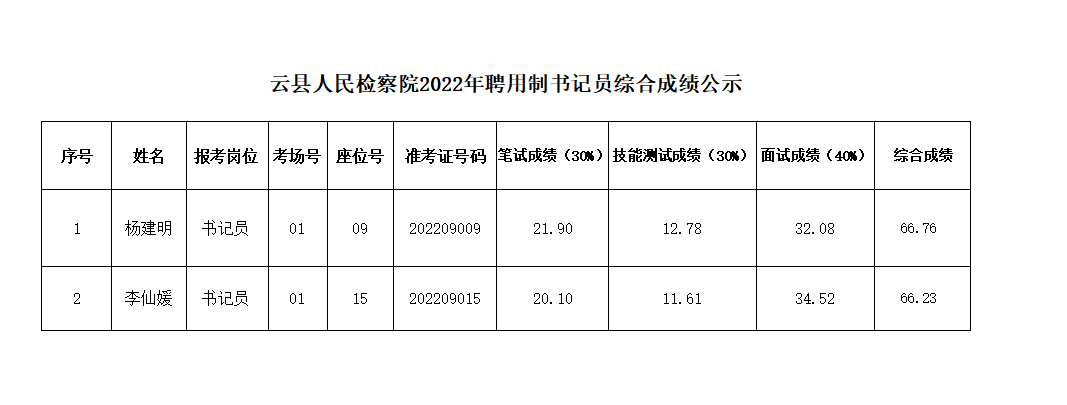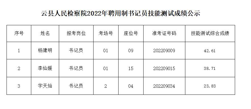 根據(jù)《云縣人民檢察院2022年聘用制書記員招聘公告》、《云縣人民檢察院2022年聘用制書記員考務(wù)工作方案》的相關(guān)要求,通過招聘信息發(fā)布、現(xiàn)場報(bào)名、資格審查、筆試、技能測試、面試等程序,現(xiàn)將3名考試人員技能測試、面試、綜合成績公示如下: