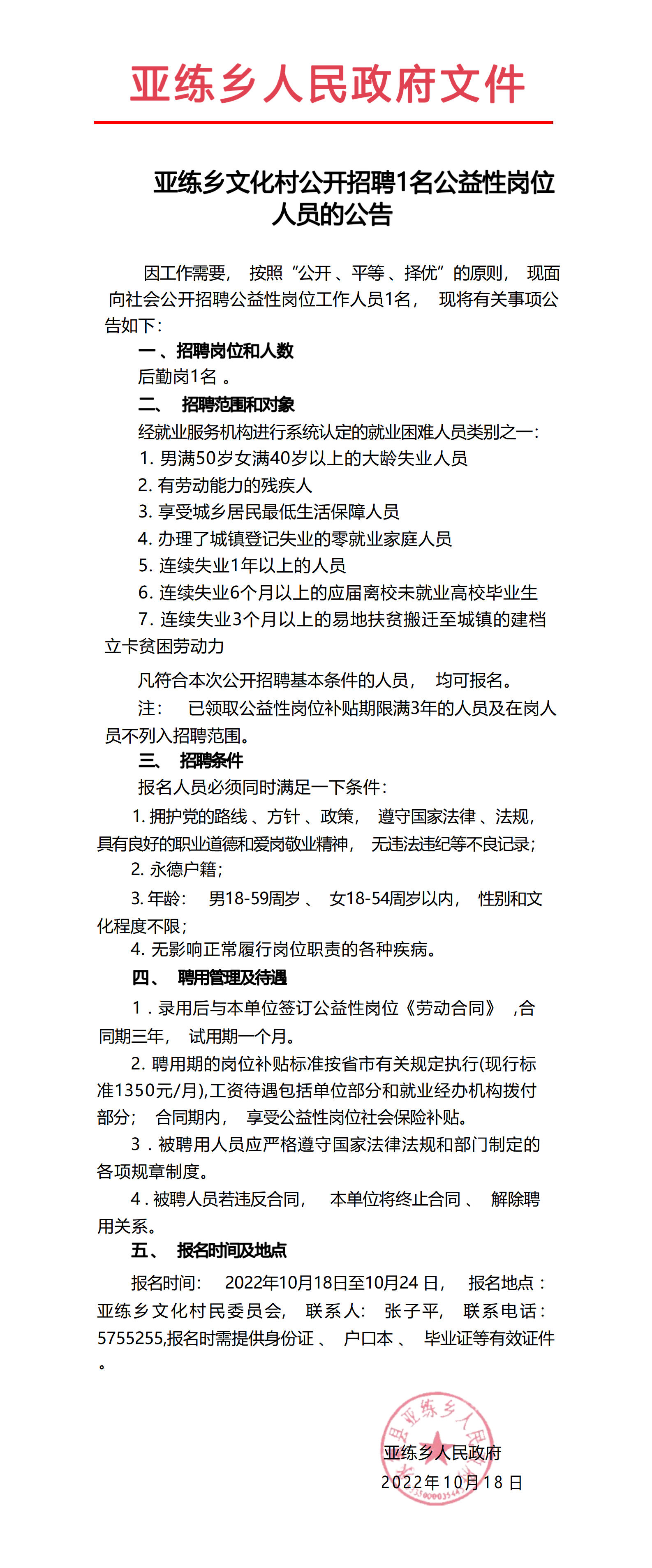 亞練鄉(xiāng)文化村公開(kāi)招聘1名公益性崗位人員的公告
