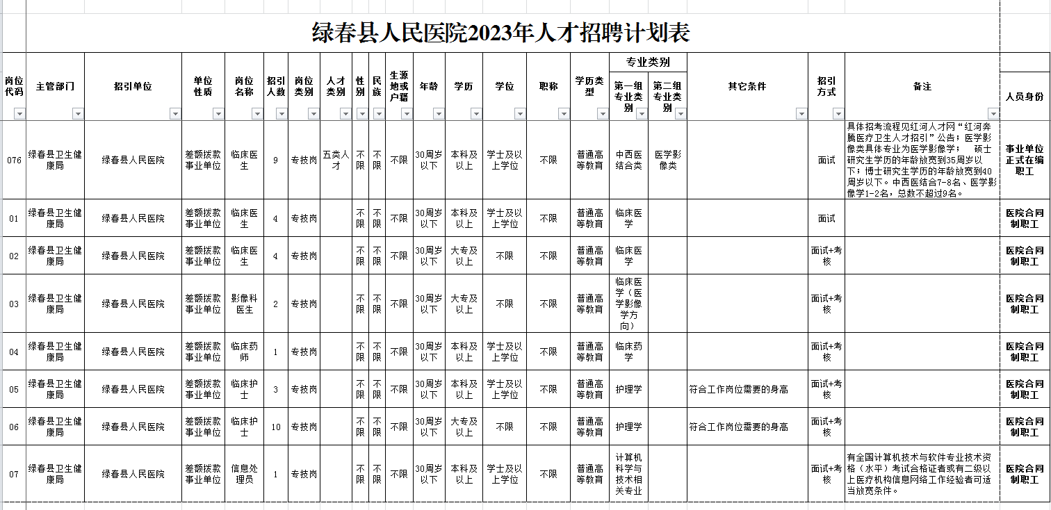 2.醫(yī)院合同制職工25名,具體見(jiàn)附件《綠春縣人民醫(yī)院2023年人才招聘計(jì)劃表》,報(bào)名截止時(shí)間為2023年2 月20日。人員招滿為止,具體面試(考核),結(jié)合現(xiàn)場(chǎng)招聘情況及醫(yī)院安排決定。專科學(xué)歷需要面試、筆試。