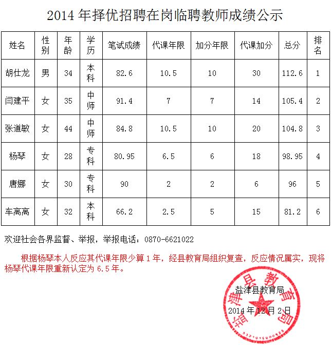 昭通市鹽津縣2014年擇優(yōu)招聘在崗臨聘教師成績公示(更正)