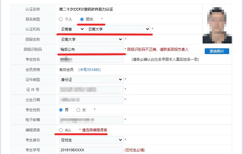 (2)報(bào)名。點(diǎn)擊“認(rèn)證報(bào)名”,進(jìn)入報(bào)名頁(yè)面,參見(jiàn)下圖。報(bào)名類型選擇“團(tuán)體”,認(rèn)證機(jī)構(gòu)選擇“云南大學(xué)”,團(tuán)報(bào)名稱選擇“云南大學(xué)”,填寫(xiě)團(tuán)體報(bào)名識(shí)別碼,該識(shí)別碼之后會(huì)單獨(dú)通知,享受團(tuán)體報(bào)名優(yōu)惠資格。根據(jù)個(gè)人情況,填寫(xiě)其他信息,上傳個(gè)人證件照片。