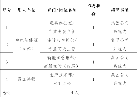根據(jù)工作需要,中電新能源本部、盈江鴻福共2家單位面向集團公司系統(tǒng)內(nèi)開展相關(guān)專業(yè)人才招聘工作。其中盈江鴻福基本情況如下: