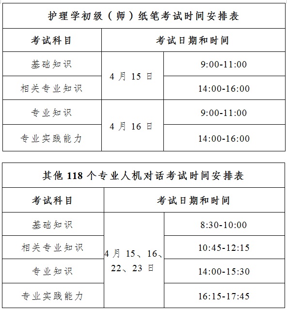 2023年護(hù)理學(xué)初級(師)專業(yè)采用紙筆作答方式進(jìn)行考試,其他118個專業(yè)采用人機對話方式進(jìn)行考試,具體安排如下: