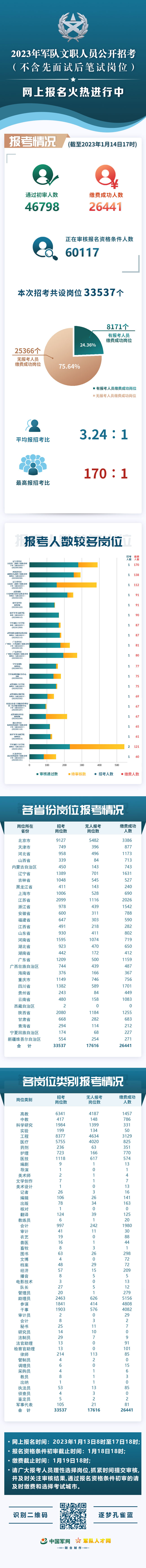 2023年軍隊文職人員公開招考網(wǎng)上報名火熱進行中。截至1月14日17時,通過網(wǎng)上報名資格條件初審的報考人員46798名,繳費成功的報考人員26441名,正在審核報名資格條件的報考人員60117名。有報考人員完成繳費的崗位8171個、占24.36%,平均報招考比為3.24∶1,最高報招考比為170∶1。此次招考網(wǎng)上報名截止時間為1月17日18:00,報名資格條件初審截止時間為1月18日18:00,繳費截止時間為1月19日18:00。請廣大報考人員理性選擇崗位,抓緊時間提交審核,并及時關(guān)注審核結(jié)果,通過報名資格條件初審的請及時繳費和選擇考試城市。相關(guān)招考崗位報考情況如下: