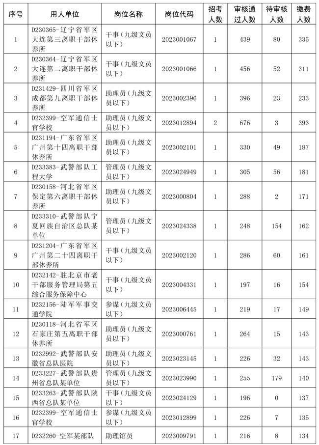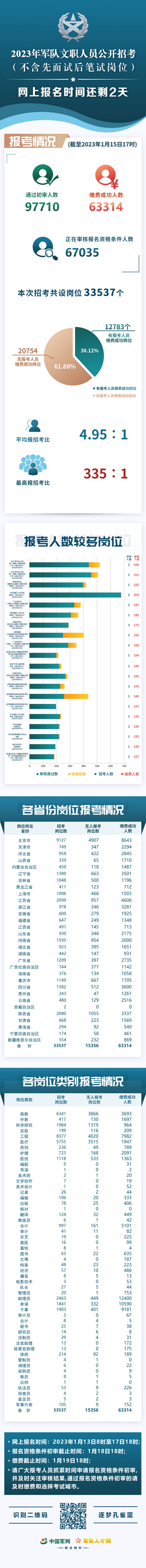 2023年軍隊文職人員公開招考網(wǎng)上報名火熱進(jìn)行中。截至1月15日17時,通過網(wǎng)上報名資格條件初審的報考人員97710名,繳費成功的報考人員63314名,正在審核報名資格條件的報考人員67035名。有報考人員完成繳費的崗位12783個、占38.12%,平均報招考比為4.95∶1,最高報招考比為335∶1。此次招考網(wǎng)上報名時間還剩2天,請廣大報考人員抓緊時間申請報名資格條件初審,并及時關(guān)注審核結(jié)果,通過報名資格條件初審的請及時繳費和選擇考試城市。相關(guān)招考崗位報考情況如下: