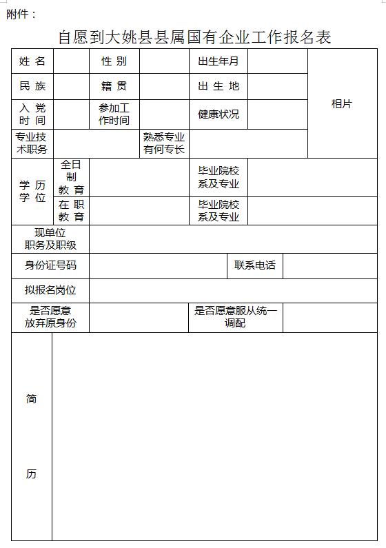 附件:自愿到大姚縣縣屬國有企業(yè)工作報(bào)名表