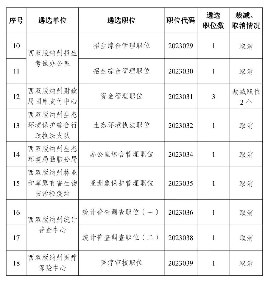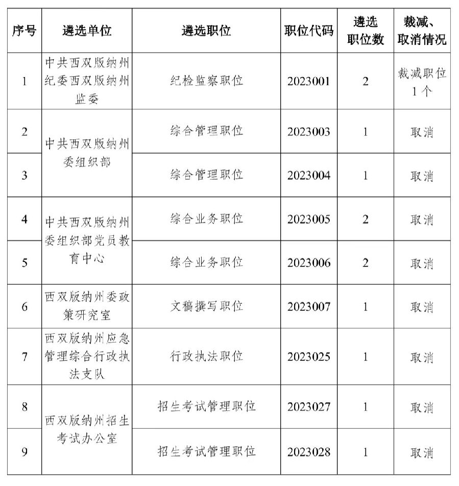 2023年西雙版納州級(jí)機(jī)關(guān)統(tǒng)一公開遴選公務(wù)員報(bào)名已于2023年3月26日18時(shí)結(jié)束。根據(jù)《2023年西雙版納州級(jí)機(jī)關(guān)統(tǒng)一公開遴選公務(wù)員公告》筆試開考比例規(guī)定,現(xiàn)將裁減、取消職位情況予以通告: