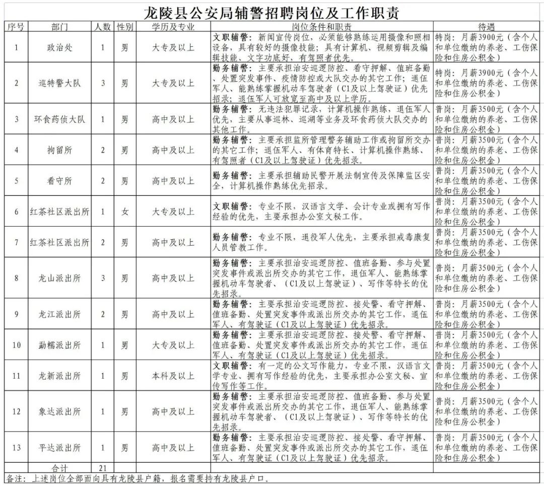 共招聘警務輔助人員21人,經綜合考核后,確定聘用的警務輔助人員與龍陵縣公安局按規(guī)定程序訂立勞動合同,招聘崗位、條件等詳見附件
