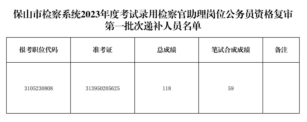 進(jìn)入資格復(fù)審第一批次遞補(bǔ)人員名單請(qǐng)登錄保山市人民檢察院門戶網(wǎng)站(http://www.baoshan.jcy.gov.cn/)查詢。