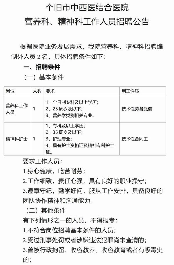 個(gè)舊市中西醫(yī)結(jié)合醫(yī)院營(yíng)養(yǎng)科、精神科工作人員招聘公告