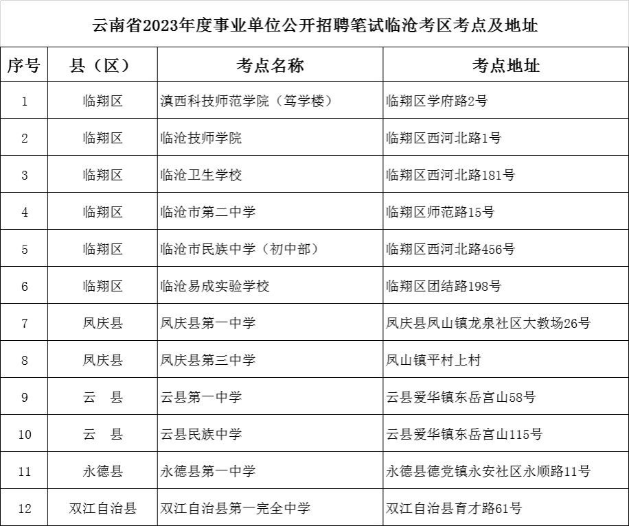 附件:云南省2023年度事業(yè)單位公開(kāi)招聘筆試臨滄考區(qū)考點(diǎn)及地址