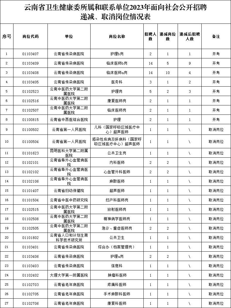 按照云南省事業(yè)單位招聘工作人員相關政策規(guī)定和《云南省衛(wèi)生健康委所屬和聯系單位2023年面向社會公開招聘工作人員的公告》,因部分崗位報名及資格審核后未達到開考比例,現將遞減、取消崗位情況進行公告。取消崗位的報考人員報名費將退回本人繳費賬戶。