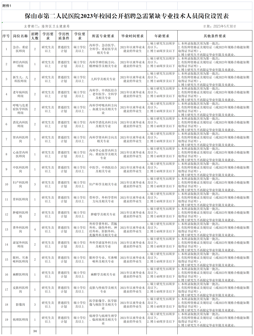 本次校園公開招聘崗位為保山市第二人民醫(yī)院編制內(nèi)事業(yè)單位專業(yè)技術(shù)人員,招聘人數(shù)34人,崗位具體要求詳見《保山市第二人民醫(yī)院2023年校園公開招聘急需緊缺專業(yè)技術(shù)人員崗位設(shè)置表》。