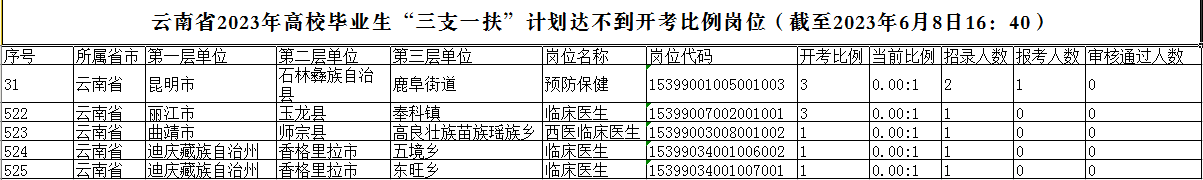 2023年云南省三支一扶計(jì)劃達(dá)不到開考比例崗位(截至6月8日16:40)