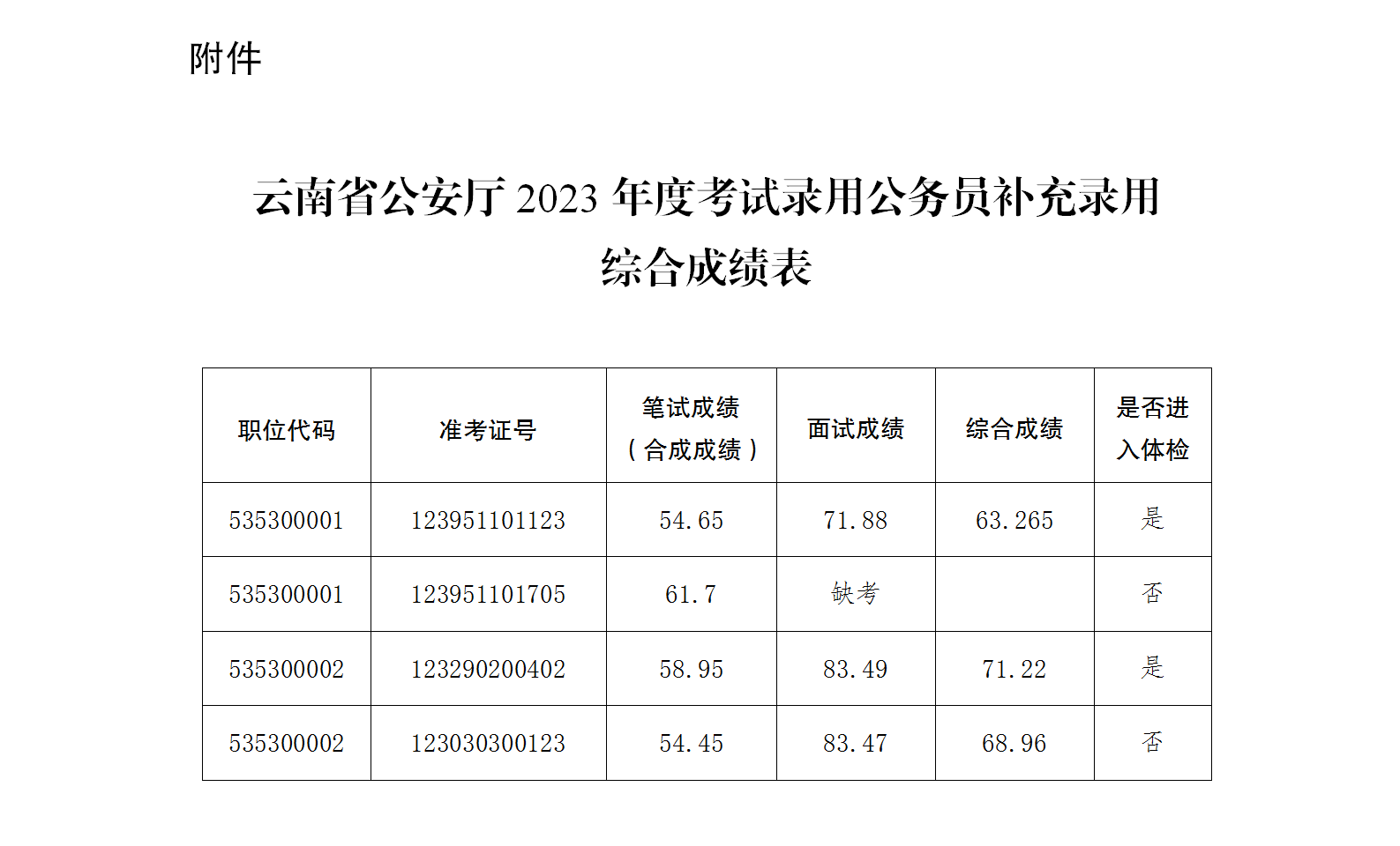 附件:云南省公安廳2023年度考試錄用公務(wù)員補(bǔ)充錄用綜合成績(jī)表