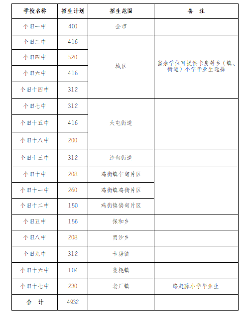 詳見《個舊市2023年初中七年級招生計劃表》。