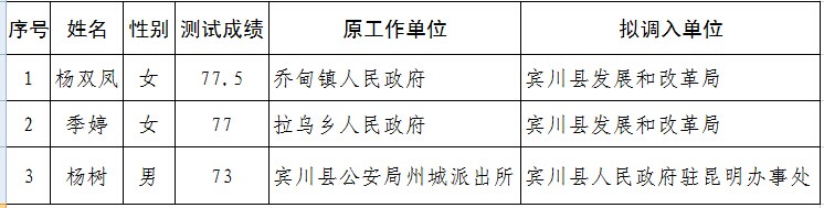 根據(jù)《賓川縣縣直機關公開選調公務員暫行辦法》和《關于認真做好2014—2015年縣直機關公開選調公務員的通知》規(guī)定,經(jīng)基礎知識測試、用人單位考察和縣政府審批,現(xiàn)將第二批擬調動人員情況公示如下: