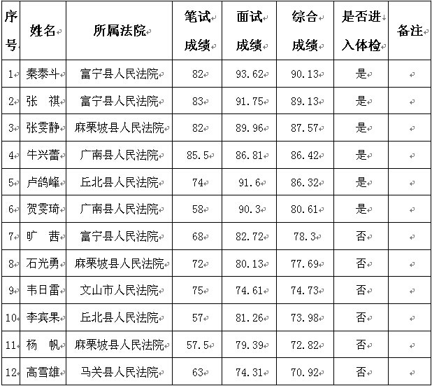 文山州中級人民法院2015年遴選司法工作人員面試工作于2015年1月17日結束,現(xiàn)公告參加面試考生成績,接受社會監(jiān)督公告期為5天,監(jiān)督電話:0876-2199011。