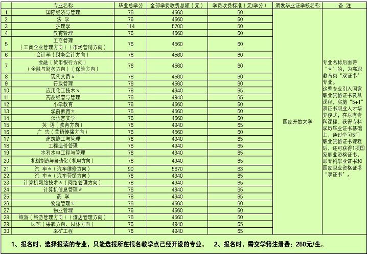 報名手續(xù):1、報名時,須交驗有效畢業(yè)證書原件;提交身份證和畢業(yè)證書復印件各1份,免冠數(shù)碼電子照片1份,電子照片要求為彩色圖像、背景為藍色、被拍攝人著白色或淺色系衣服、150(寬)×210(高)像素、文件大小不能超過40K,并按照1人1個圖像文件的方式存儲,圖像文件格式為“jpg”;2、填寫《國家開放大學(中央廣播電視大學)“開放教育”學生報名登記表》和《入學資格承諾書》;3、交納學籍注冊建檔費250元。其中: