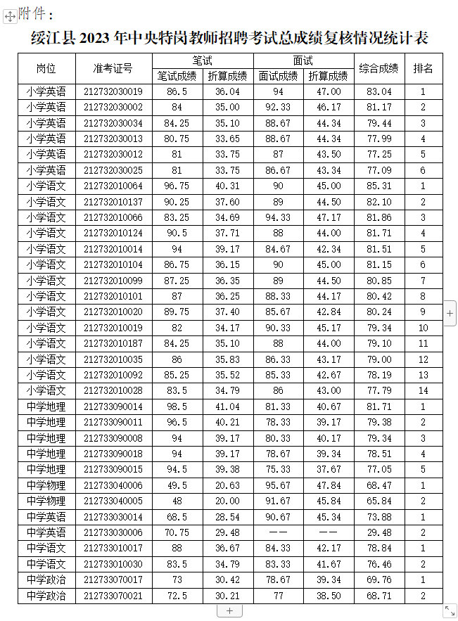 綏江縣教育體育局關(guān)于2023年中央特崗教師招聘考試總成績復(fù)核結(jié)果的公示