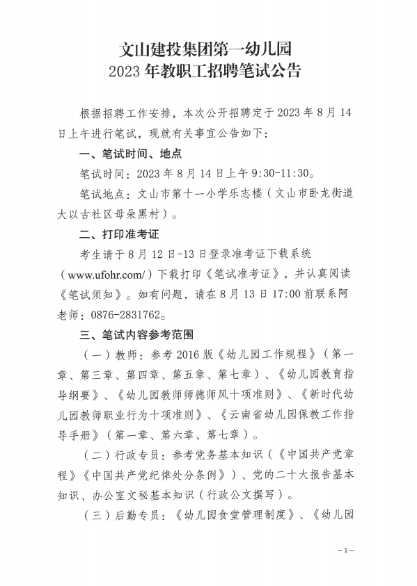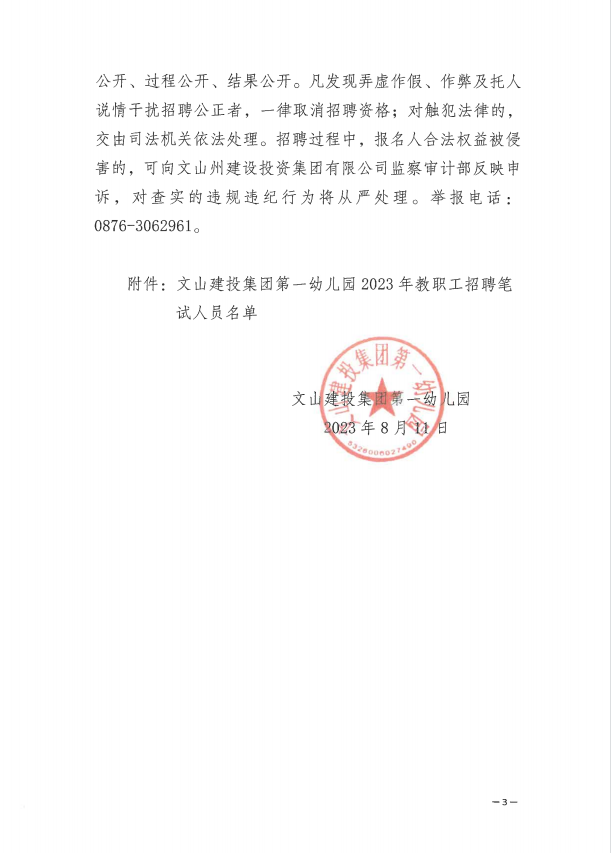 文山建投集團(tuán)第一幼兒園2023年教職工招聘筆試人員名單