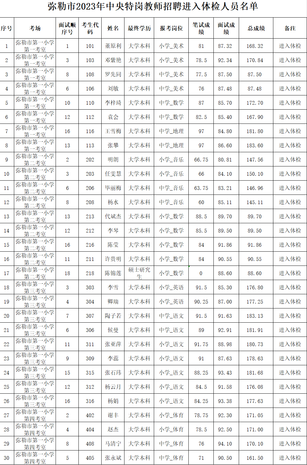 附件:彌勒市2023年招聘特崗教師面試成績及進入體檢人員名單