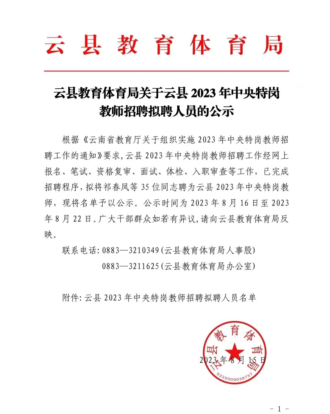 云縣2023年中央特崗教師招聘擬聘人員的公示