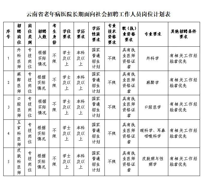詳見附件1《云南省老年病醫(yī)院長期面向社會公開招聘工作人員崗位計劃表》,請在醫(yī)院官方網(wǎng)站人才招聘欄下載。