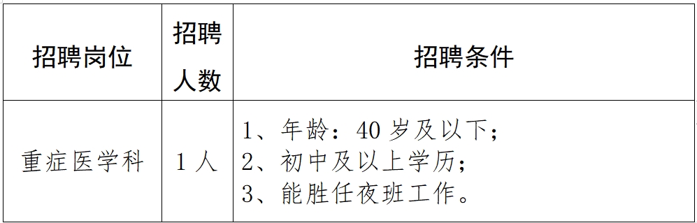 根據(jù)醫(yī)院業(yè)務(wù)發(fā)展需求,我院重癥醫(yī)學(xué)科需招聘勞務(wù)派遣工作人員1名,具體招聘條件如下: