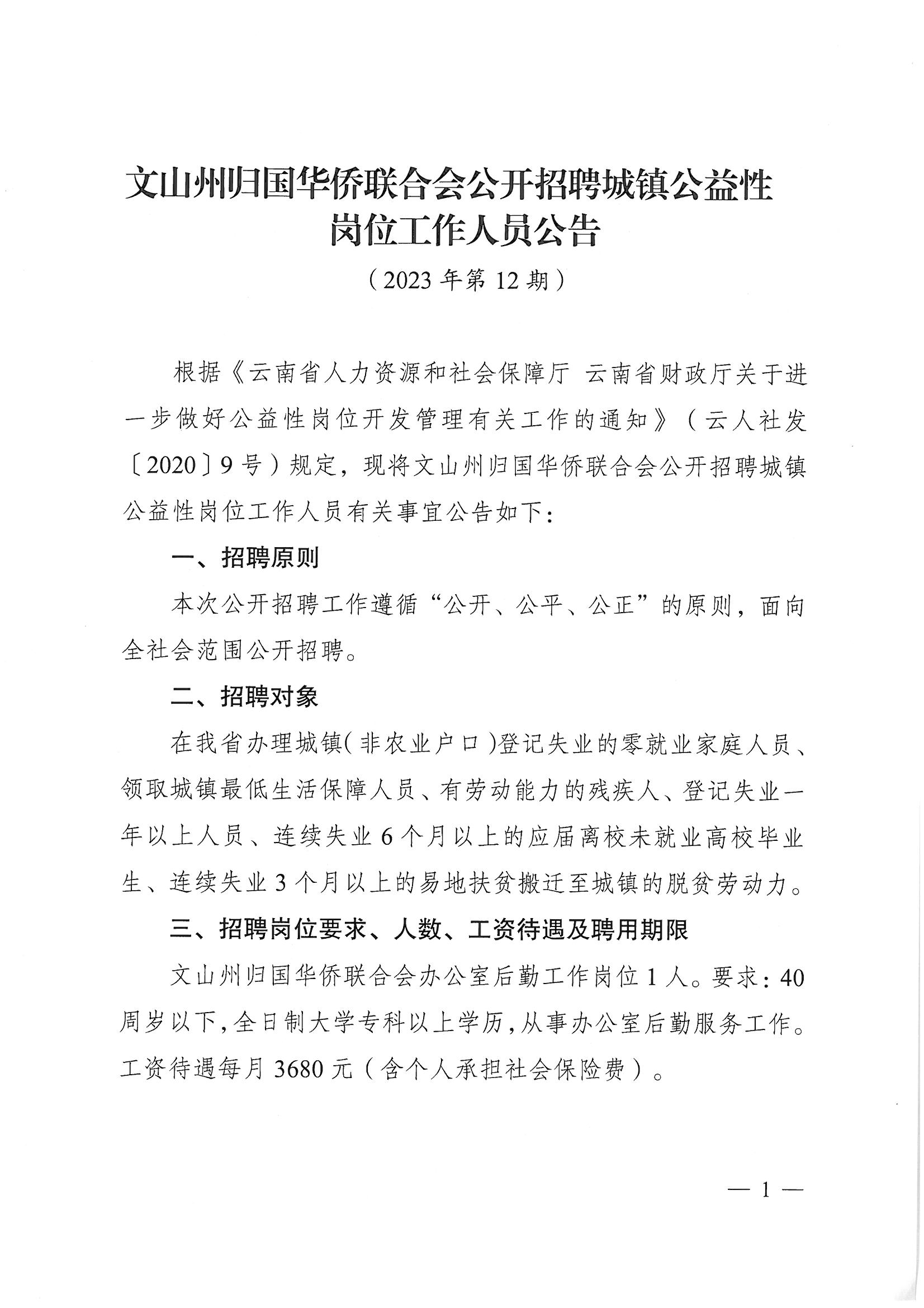 文山州歸國(guó)華僑聯(lián)合會(huì)公開(kāi)招聘城鎮(zhèn)公益性崗位工作人員公告