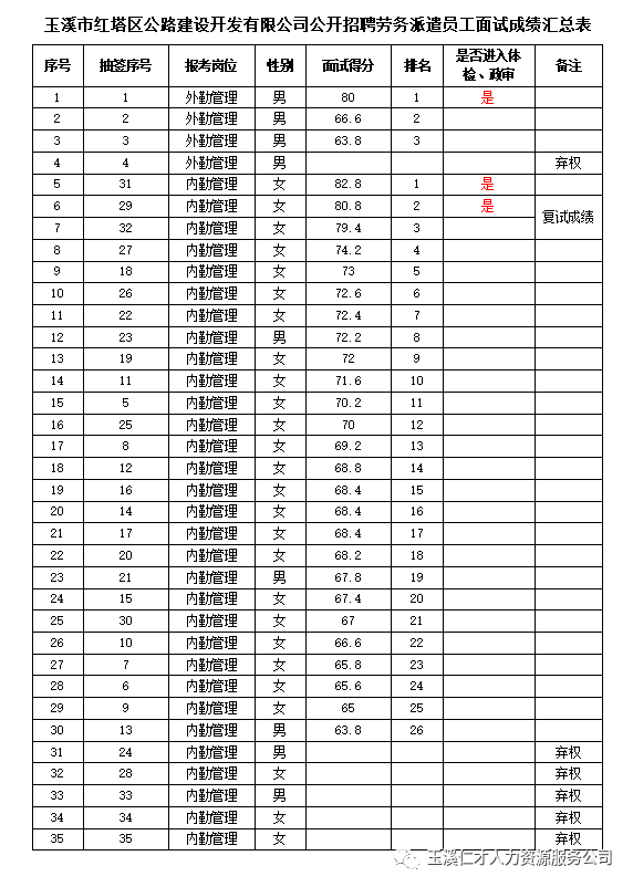根據(jù)《玉溪市紅塔區(qū)公路建設(shè)開發(fā)有限公司公開招聘勞務(wù)派遣員工公告》,通過資格初審,報(bào)名人數(shù)共35名(項(xiàng)目現(xiàn)場(chǎng)管理4名,項(xiàng)目?jī)?nèi)勤管理31名)。2023年12月18日上午9:00進(jìn)行面試,實(shí)際參加面試人數(shù)29名(項(xiàng)目現(xiàn)場(chǎng)管理?xiàng)墮?quán)1名,項(xiàng)目?jī)?nèi)勤管理?xiàng)墮?quán)5名)。經(jīng)過面試,成績(jī)經(jīng)全程監(jiān)督、現(xiàn)場(chǎng)打分確定,現(xiàn)將面試成績(jī)予以公示。并根據(jù)《玉溪市紅塔區(qū)公路建設(shè)開發(fā)有限公司公開招聘勞務(wù)派遣員工公告》,將進(jìn)入下一環(huán)節(jié)--體檢政審人員名單進(jìn)行公示,公示期共3天,自2023年12月20日至12月22日。公示期間如有問題、意見、建議,請(qǐng)?jiān)谏鲜鲆?guī)定時(shí)間內(nèi)(上午8:30-11:30,下午14:30-17:30)致電:19987714651(尹老師)。