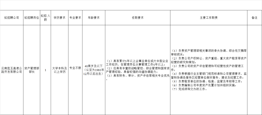 附件1:云南昆玉高速公路開發(fā)有限公司公開招聘任職條件