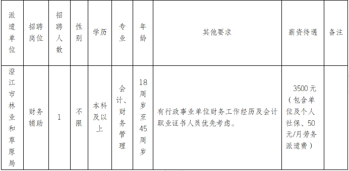 澄江市林業(yè)和草原局因工作需要,現(xiàn)委托澄江市啟澄人力資源有限責(zé)任公司,面向社會公開招聘財務(wù)輔助崗工作人員1名,現(xiàn)將有關(guān)事項公告如下: