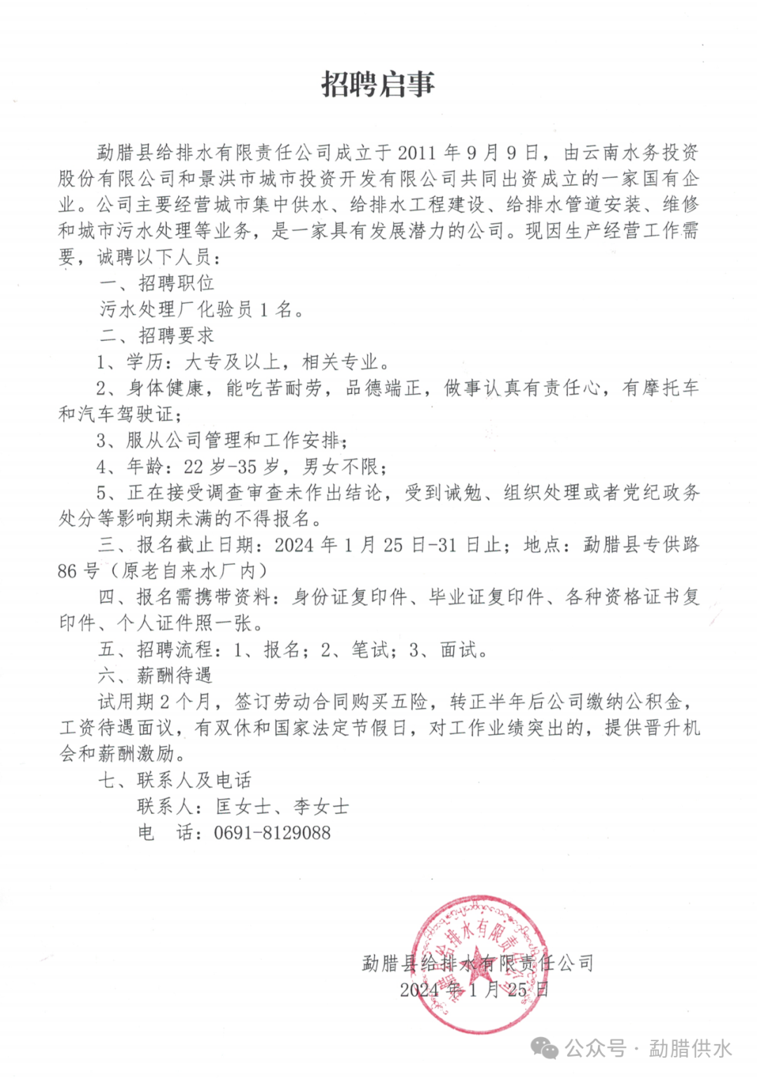 2024年西雙版納州勐臘縣給排水有限責(zé)任公司招聘啟事
