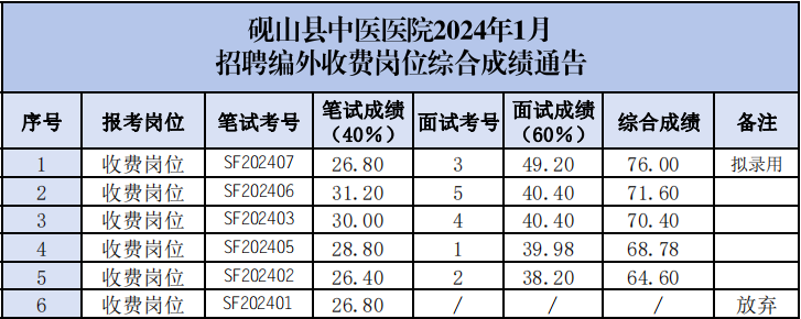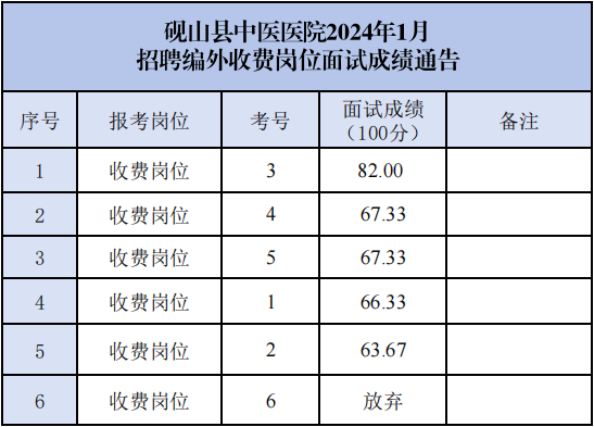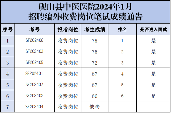 硯山縣中醫(yī)醫(yī)院2024年1月招聘編外收費(fèi)崗位成績(jī)通告