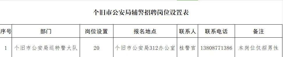 根據(jù)工作需要,個(gè)舊市公安局面向社會(huì)公開(kāi)招聘輔警,現(xiàn)將有關(guān)事項(xiàng)公告如下: