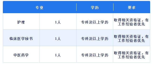 2.應(yīng)往屆高校畢業(yè)生專科及以上學(xué)歷,具有相應(yīng)執(zhí)業(yè)資格、專業(yè)技術(shù)職務(wù)任職資格,有工作經(jīng)驗者優(yōu)先;